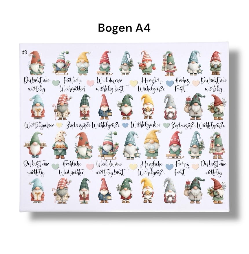 Rub-Ons-Sticker, #3 Mini-Wichtel pastell, kleine Motive, Weihnachten, DIN A4, randlose Rubons