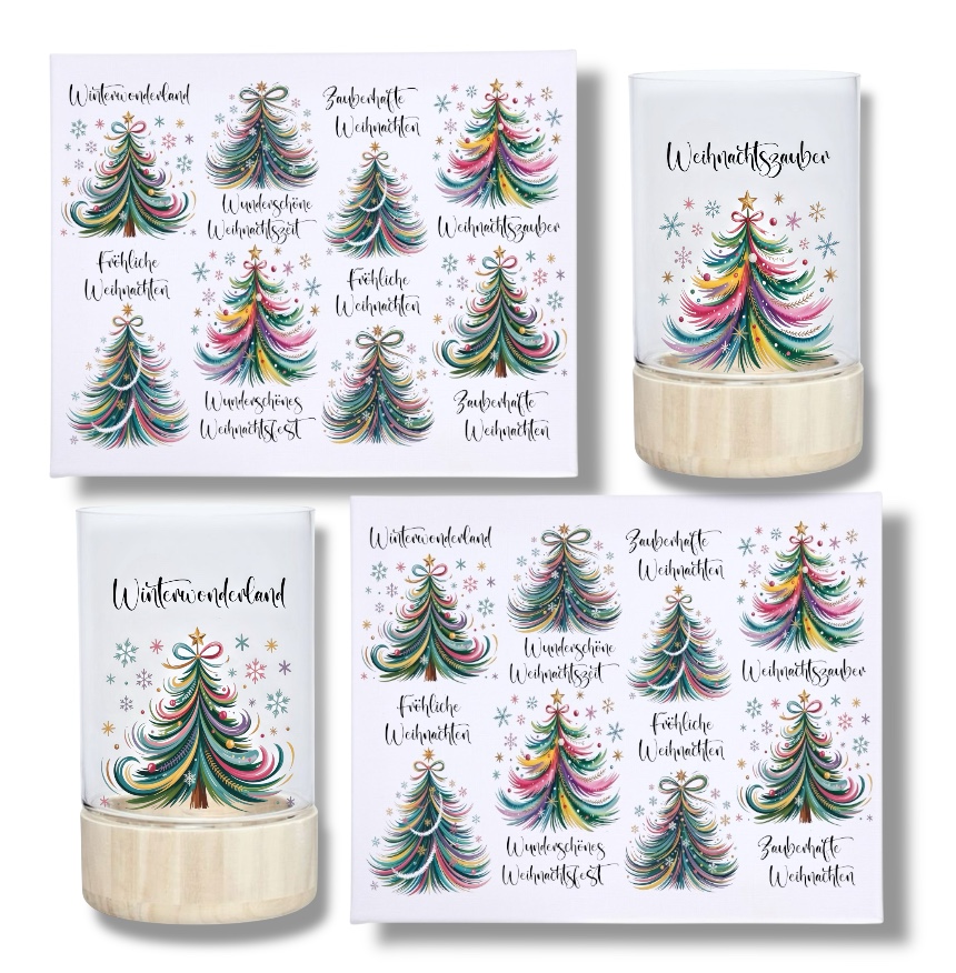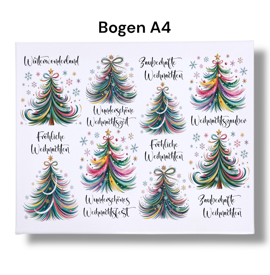 Rub-Ons-Sticker, bunte Tannenbäume, DIN A4, Sprüche, Weihnachten, randlose Rubons